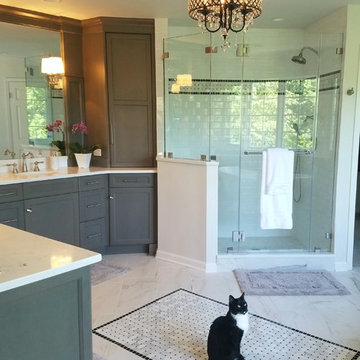 An upscale and timeless master bathroom to die for! Double vanities flanking vanity area with Belmont Cabinetry and quartz counter tops. Freestanding Tub by Metro Collection. Carrera Marble rug with Porcelain planking. Roman Shades in Gray and White Linen with birds and floral design. Drum shade in black with crystals complete this beauty of a room. Thanks to Trueleaf Kitchens for a fabulous design and implementation. Wonderful collaboration!